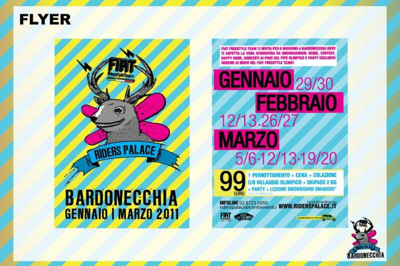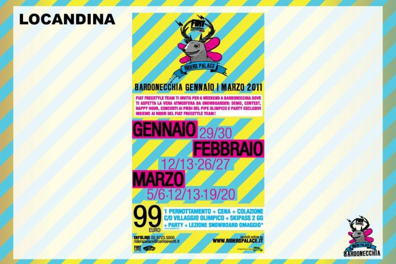 Riders Palace è il format di weekend sulla neve “cheap & chic” che avvicina i giovani al mondo snowboarde freestyle e unisce l’unicità di contenuti del mondo snowboard e freestyle core alla convenienza di un pacchetto tutto compreso di grande accessibilità per il target universitario di riferimento.