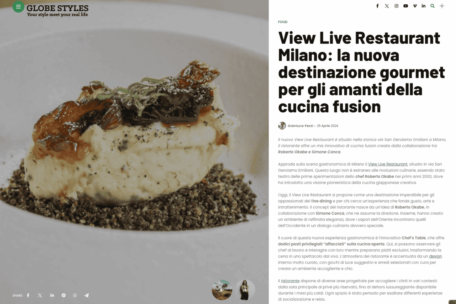 Approda sulla scena gastronomica di Milano il View Live Restaurant, situato in via San Gerolamo Emiliani. Questo luogo non è estraneo alle rivoluzioni culinarie, essendo stato teatro delle prime sperimentazioni dello chef Roberto Okabe nei primi anni 2000, dove ha introdotto una visione pionieristica della cucina giapponese creativa.