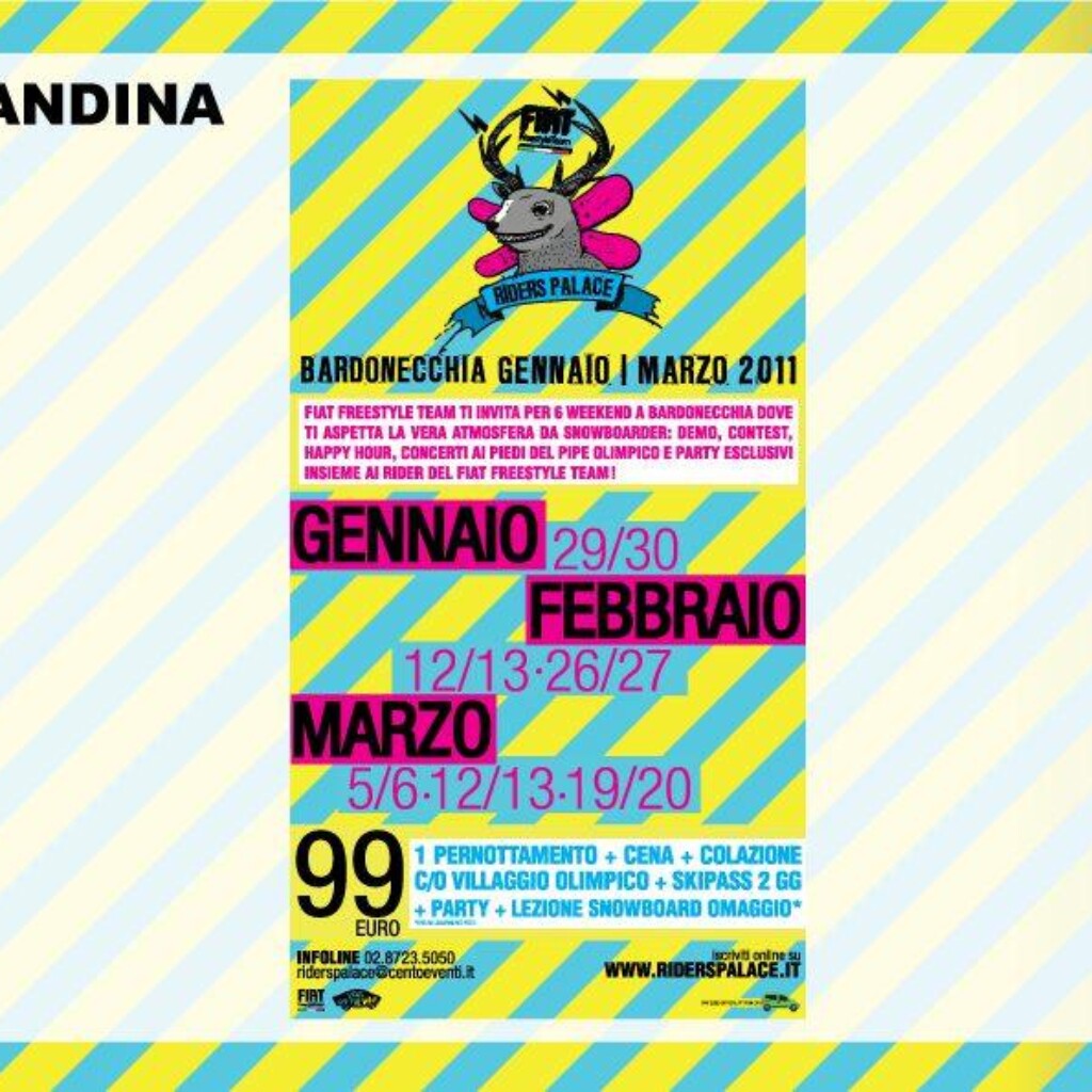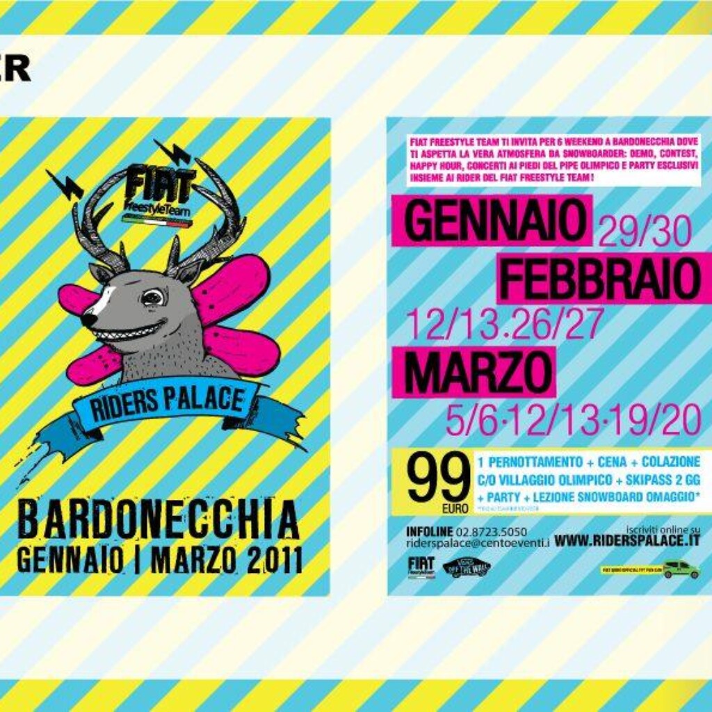 Riders Palace è il format di weekend sulla neve “cheap & chic” che avvicina i giovani al mondo snowboarde freestyle e unisce l’unicità di contenuti del mondo snowboard e freestyle core alla convenienza di un pacchetto tutto compreso di grande accessibilità per il target universitario di riferimento.